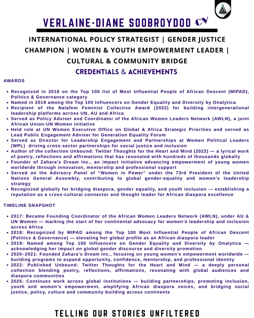 AfroNouveau Verlaine-Diane Soobroydoo represents a powerful force in gender equity, diplomacy, and global leadership, shaping systems and empowering women worldwide.